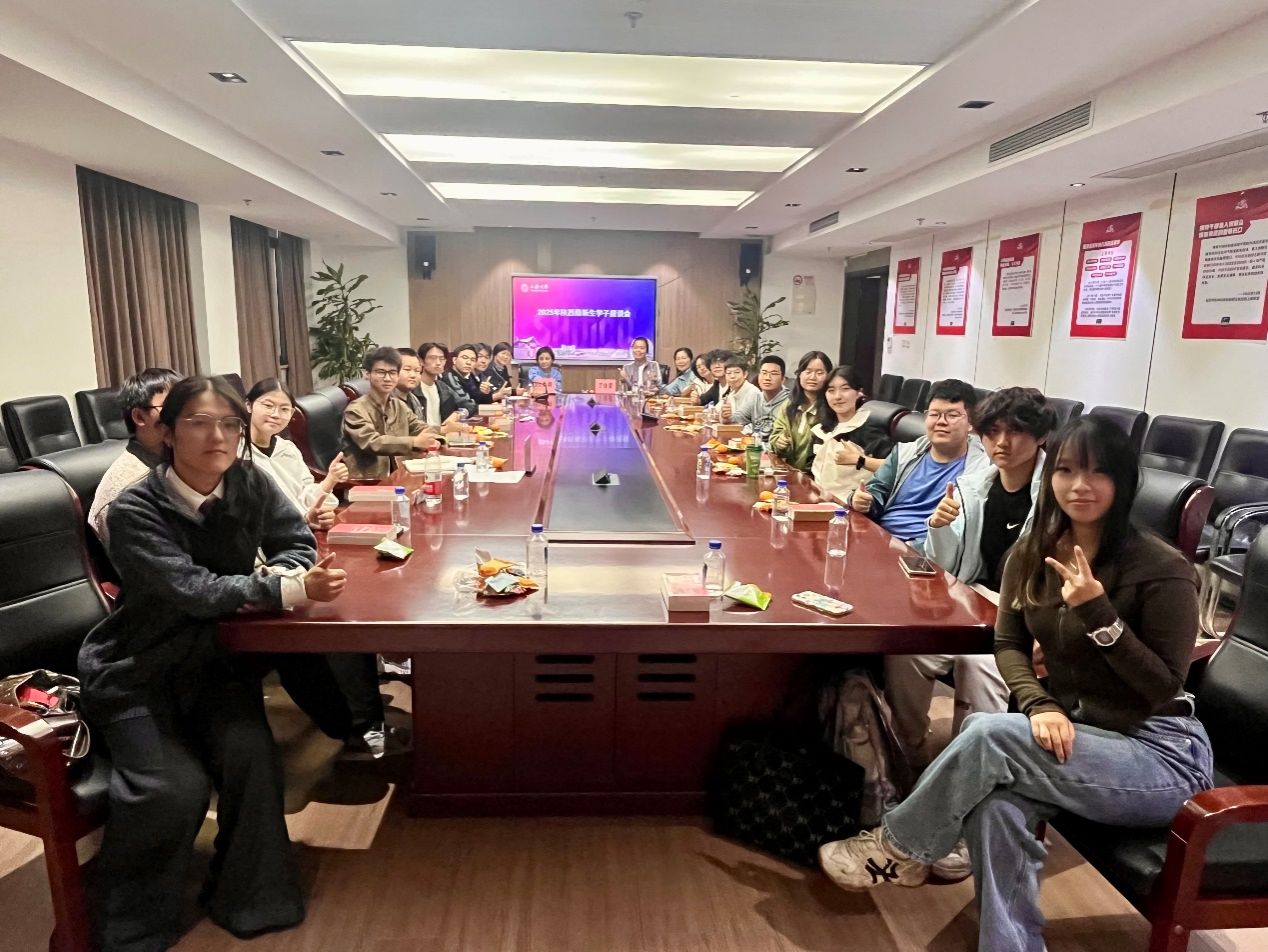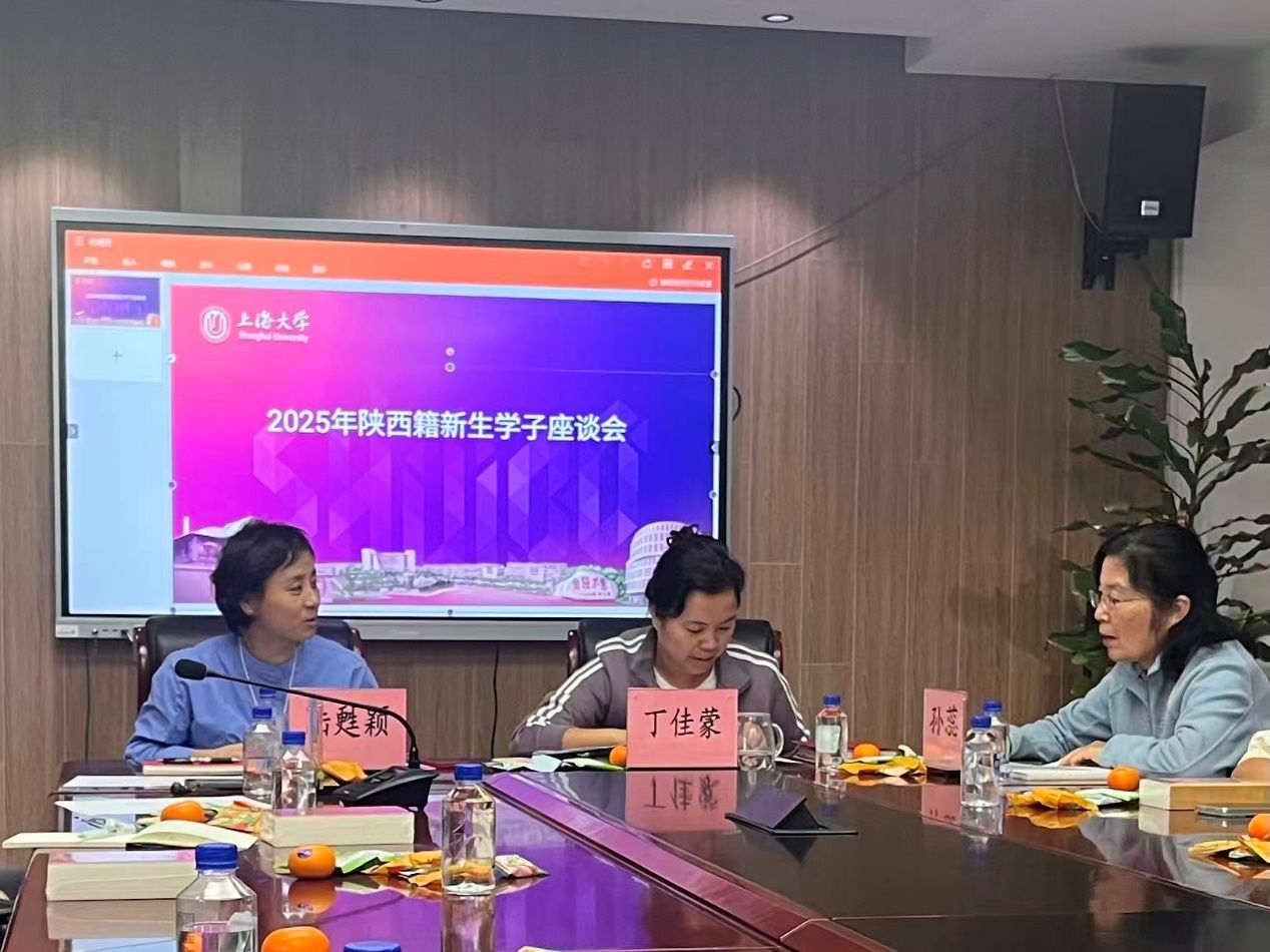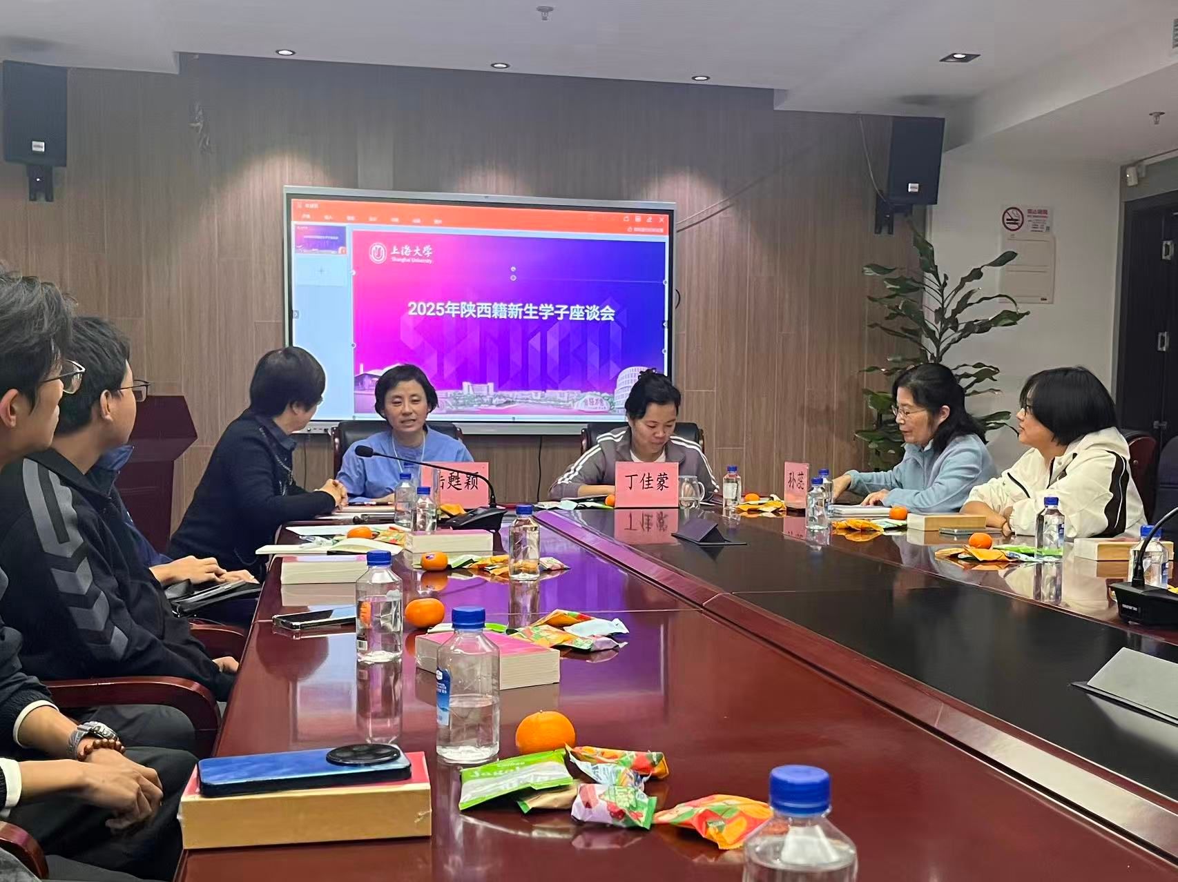 2025 年 10 月 24 日下午 4 点,上海大学陕西招宣组在文学院 306 会议室举行 2025 级陕西籍新生座谈会。上海大学招生就业处招生主管叶亮,上海大学文学院党委书记兼陕西招宣组组长陆甦颖,上海大学文学院党委副书记、副院长兼陕西招宣组副组长丁佳蒙,陕西校友会顾问孙蕊亲临现场,3 位 24 级陕西籍优秀学长与 14 位 25 级陕西籍新生齐聚一堂,共话成长。本次座谈会由陕西招宣组联络员李姝婷老师全程主持,氛围温馨而热烈。