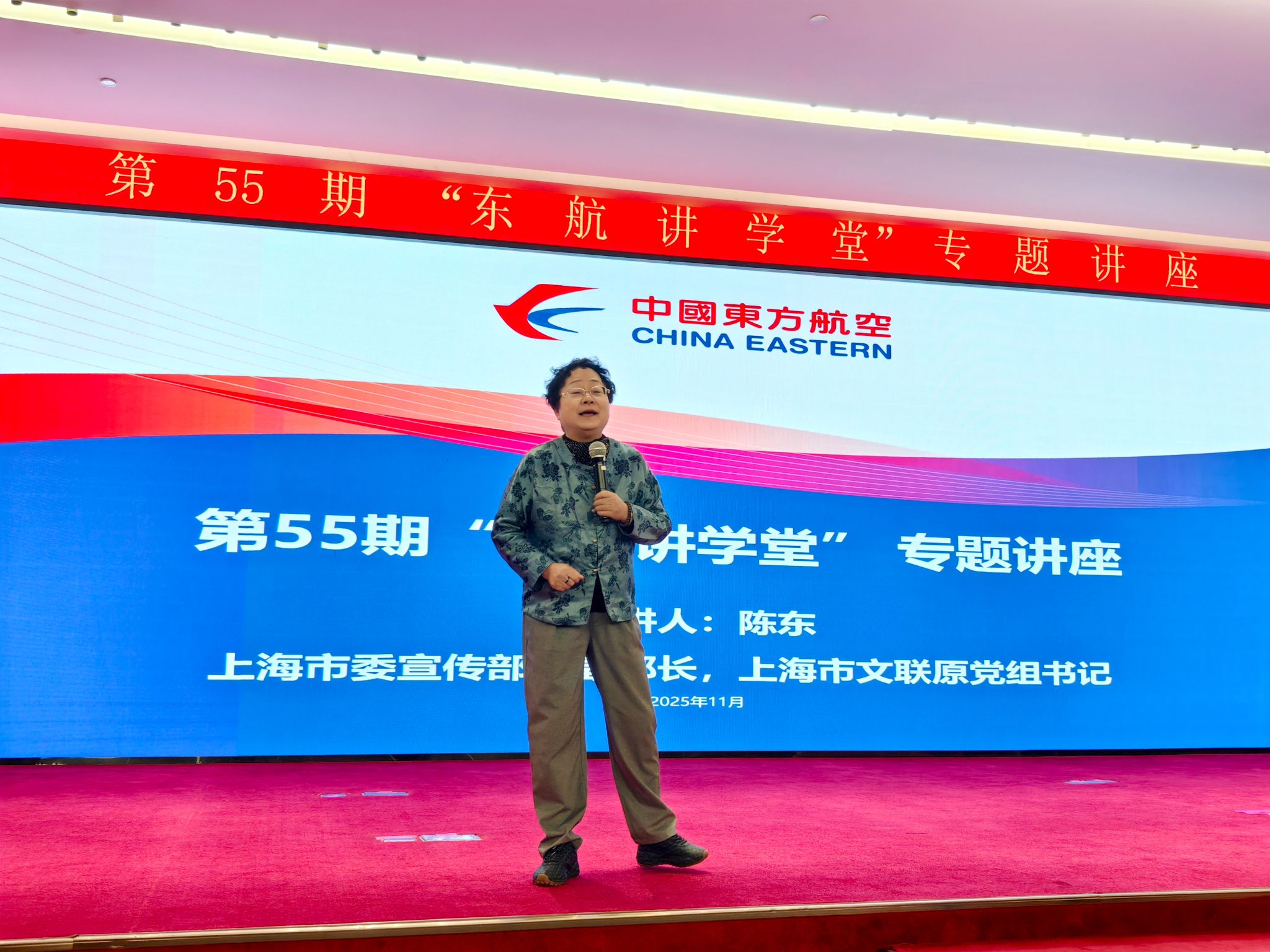 当天下午,“东航讲学堂”在东航之家C1报告厅举行,陈东作为主讲人带来题为《从<繁花>现象浅谈海派文化的独特魅力》的讲座。中国东航董事、党组副书记成国伟,中国东航党组成员、副总经理周启民出席讲座。