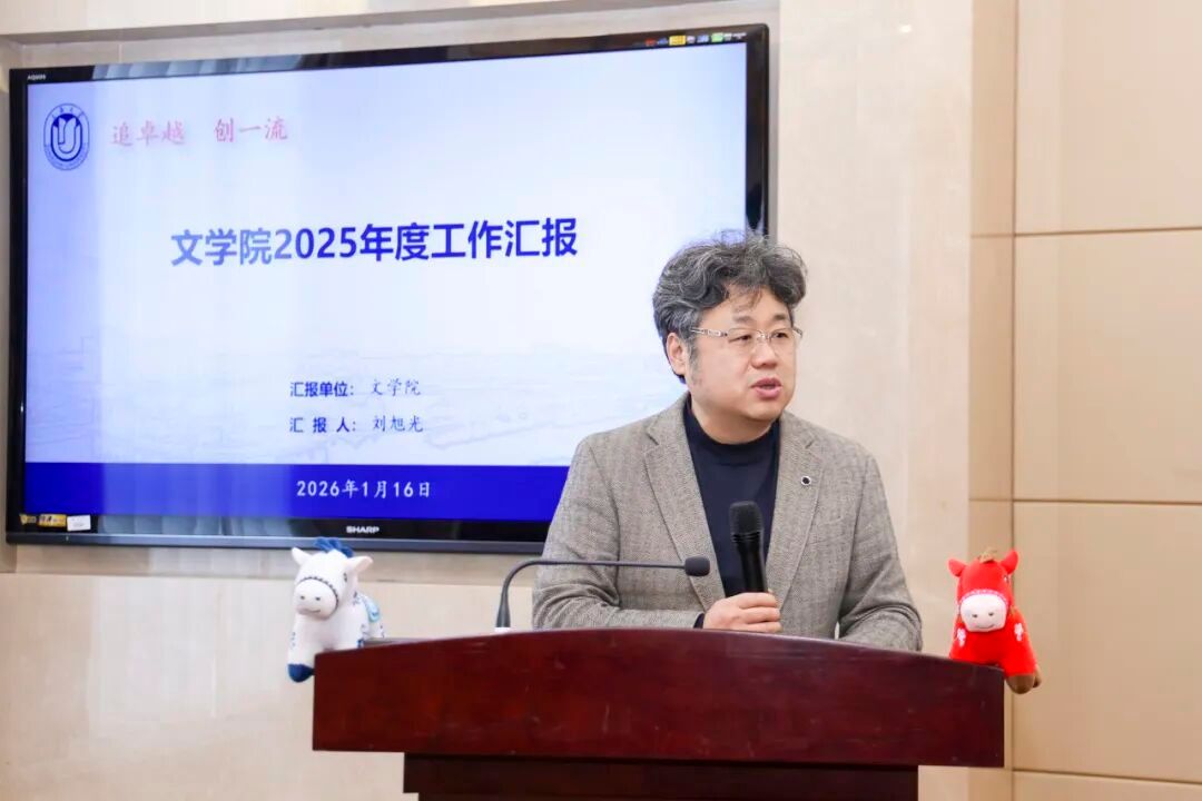 会议伊始,上海大学文学院院长刘旭光教授进行了2025年度工作总结报告。刘院长以“实打实”为关键词,系统总结了2025年文学院关键业绩完成情况与工作亮点,并对2026年文学院工作指标进行了规划与展望。