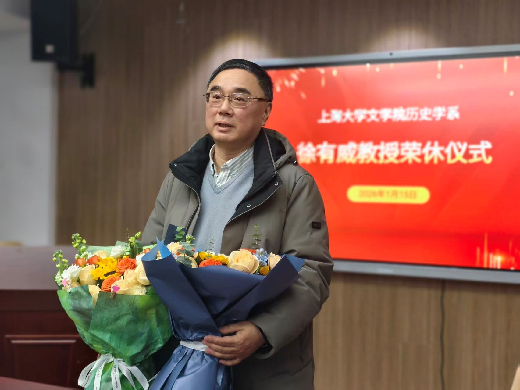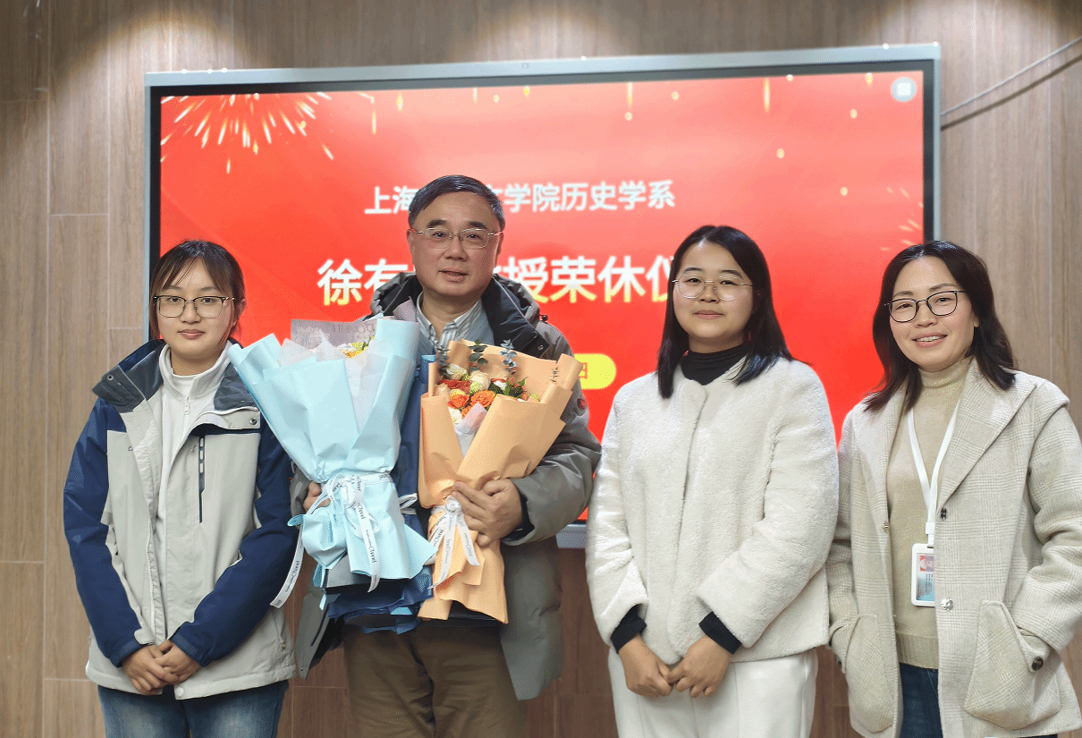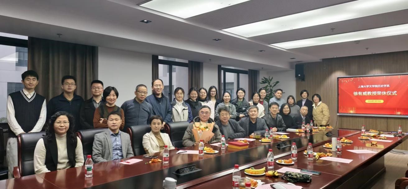 2026年1月15日下午,文学院历史学系举办徐有威教授荣休仪式。文学院党委书记陆甦颖,院长刘旭光,党委副书记、副院长丁佳蒙,副院长宁镇疆、杨长云,历史学系主任郭丹彤,文学院教师代表及在读学生代表出席本次仪式。仪式由郭丹彤主持。