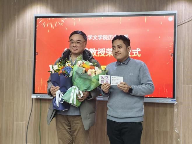 中国科学院自然科学研究所和自然科学研究所世界科技史研究室主任田淼研究员特委托徐之凯老师代向徐有威教授献上鲜花,祝贺徐有威教授荣休。