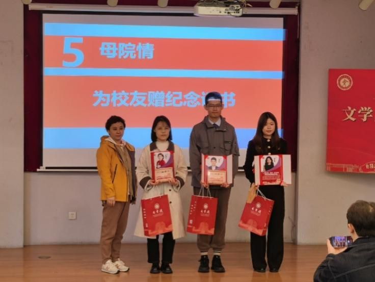 最后,文学院党委书记陆甦颖为三位优秀校友赠纪念证书,全体师生共同合影,定格温馨瞬间,也让文学院薪火相传的校友情谊愈发深厚。