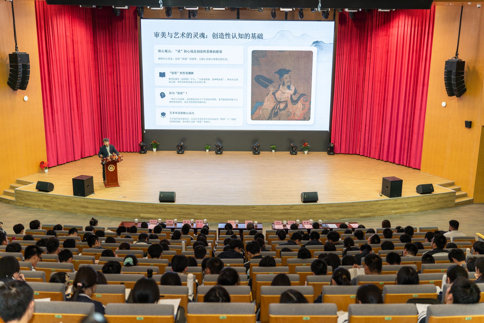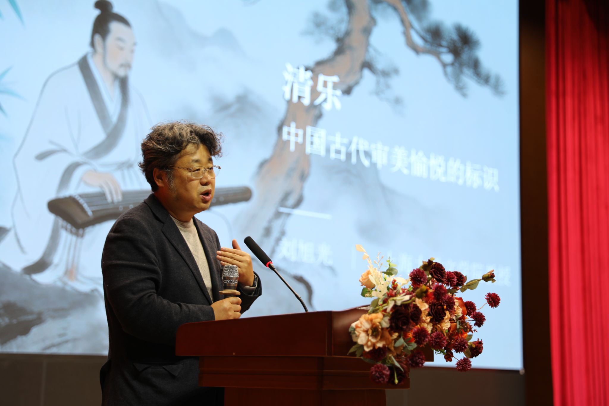 讲座中,刘旭光教授以苏轼“人间有味是清欢”、邵雍“清欢虽剩且无忧”等经典名句为切入点,结合郭熙《林泉高致》的山水意境,系统阐释了“清乐”这一中国古代文人士大夫的审美概念。他指出,“清乐”是心灵摆脱物质欲望束缚后,在自然或艺术中获得的自由而宁静的愉悦,是一种“因为美,所以欢喜”的纯粹审美体验,也是中国古代审美自觉与自律的重要标识。刘旭光教授围绕“清乐”的本质内涵、获得途径及其与心灵自由的关系展开深入讲解,从林泉山水的自然之趣,到琴棋书画的艺术之美,用深入浅出的语言、生动鲜活的案例,带领同学们探寻传统美学中“清乐”的源头活水,让大家在潜移默化中理解审美愉悦的深层意蕴。
